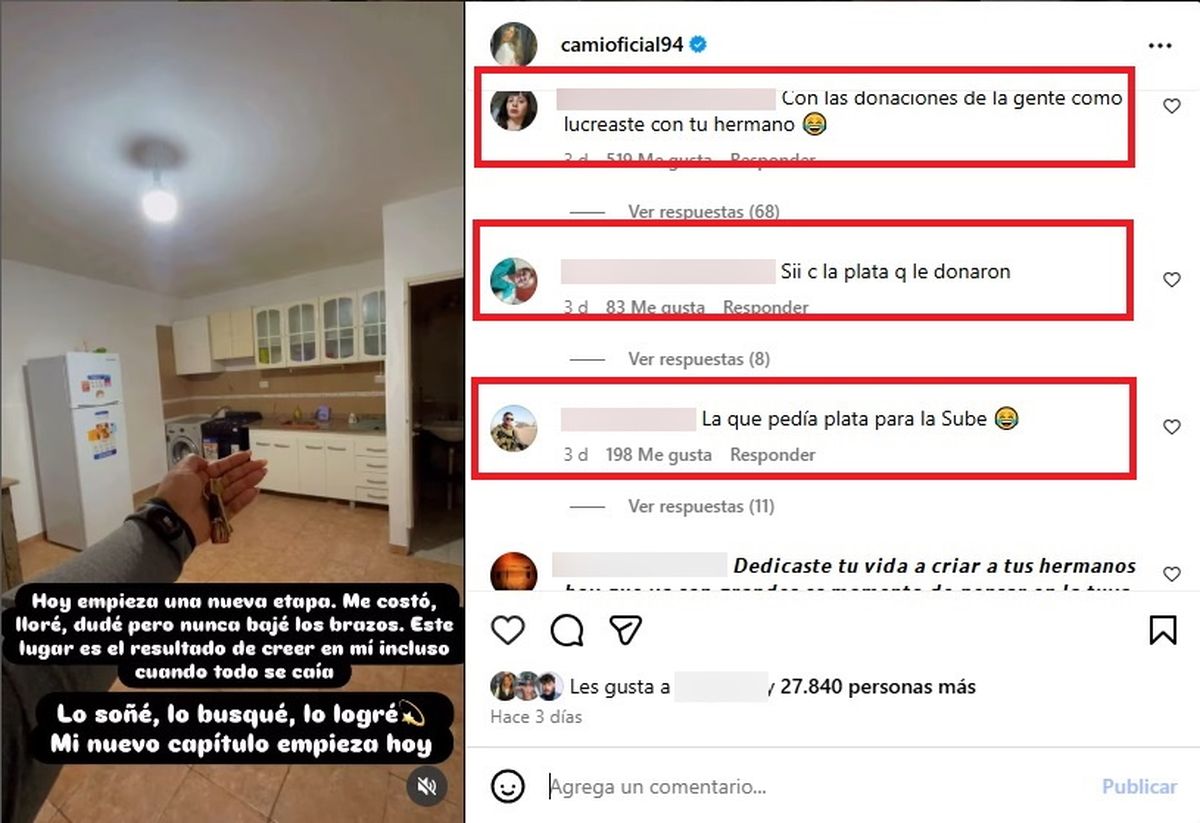 "Hace un mes ni tenías plata para ayudar a tu hermano que estaba en el hospital... Perdón pero hoy te comprás una departamento? Una casa? Mmmm no sé", "Gracias a las donaciones y a la plata que te dio la gente. Agradecele a ellos", "Con las donaciones de la gente cómo lucraste con tu hermano" o "La que pedía plata para la Sube", son sólo algunos de los muchos filosos comentarios que le dejaron a Camilota en su publicación.