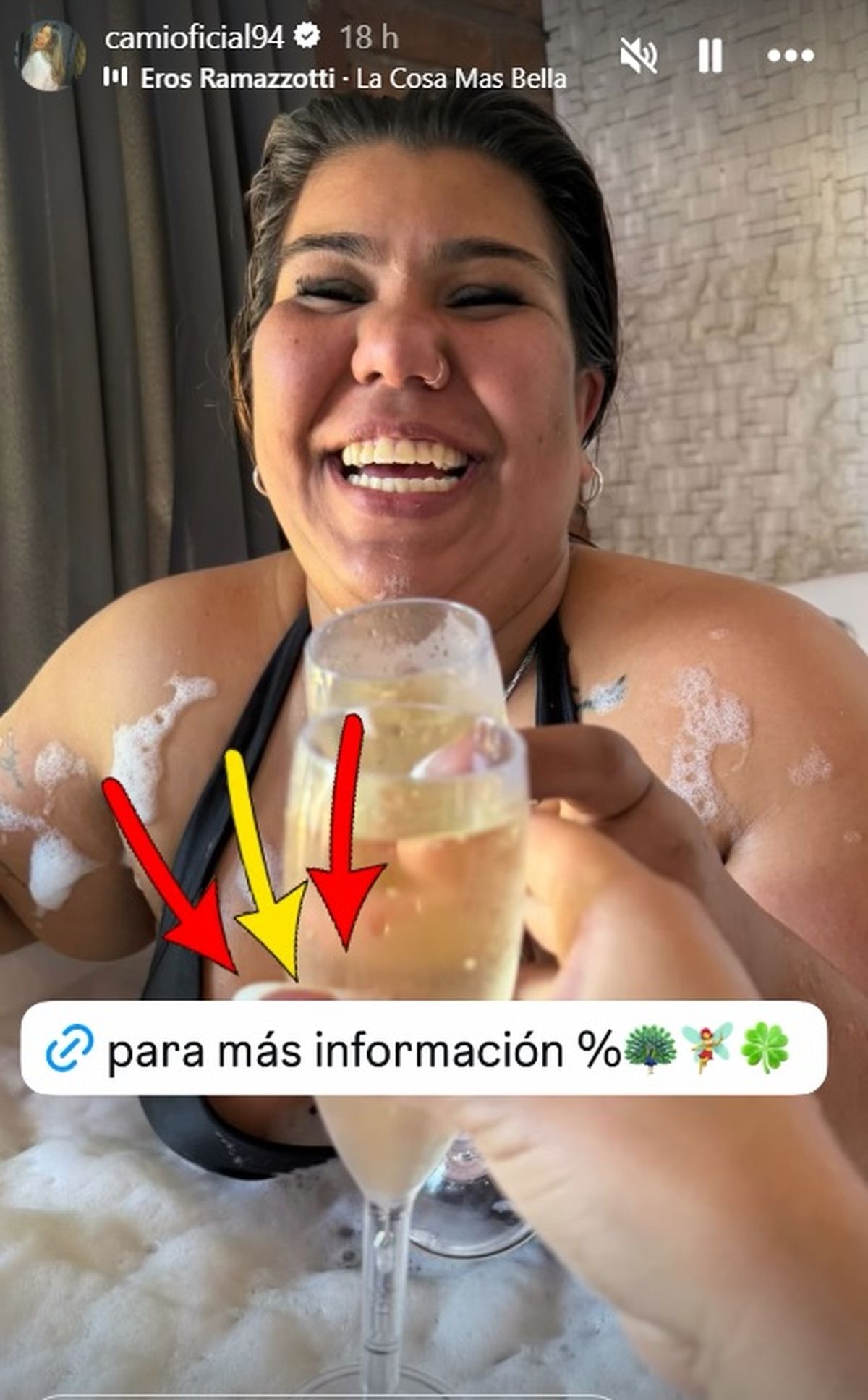 En medio de ese contexto, Camila Deniz —conocida en redes como Camilota y hermana de Thiago Medina— encendió la polémica con una publicación que podría traerle problemas. La joven compartió una foto desde un jacuzzi, rodeada de espuma y con una copa en la mano, pero un detalle en su historia de Instagram llamó la atención.