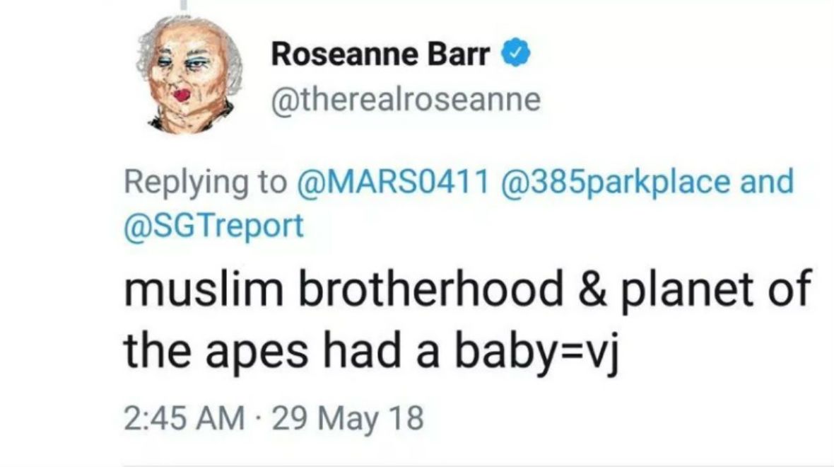La actriz Roseanne Barr causó una gran controversia al criticar a la afroamericana Valerie Jarrett, que fue asesora del expresidente de Estados Unidos Barack Obama, asegurando en un mensaje racista que ella era como si los hermanos musulmanes y la película "Planeta de los simios" hubieran tenido un hijo.