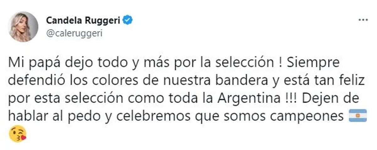 “Dejen de hablar al pedo y celebremos que somos campeones”, añadió, junto a los emojis de una bandera argentina y un carita tirando un beso.