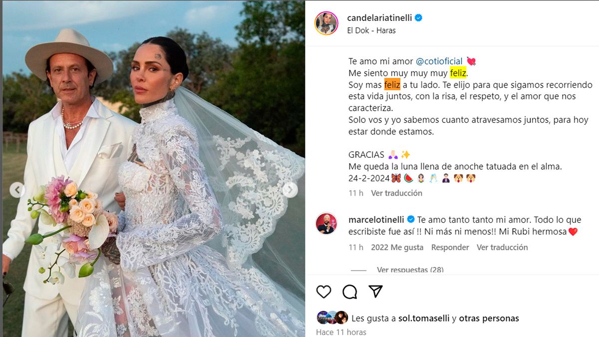 El domingo, tras la ceremonia, Cande publicó un emotivo mensaje en su cuenta de Instagram. "Anoche no fue una noche normal. Algo especial había en el aire. Se respiraba paz, amor, felicidad, y mucha emoción. Todo fue perfecto. Como tenia que ser. Lugar, familia, amigos, mis bebes de cuatro patas. Mi corazón explota de felicidad", comenzó diciendo.