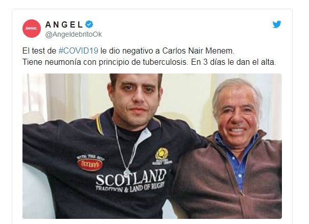 "El test de COVID-19 le dio negativo a Carlos Nair Menem. Tiene neumonía con principio de tuberculosis. En tres días le dan el alta", informó el periodista.
