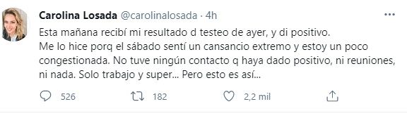 "No tuve ningún contacto que haya dado positivo, ni reuniones, ni nada. Solo trabajo y super... Pero esto es así...", finalizó Carolina, quien se encuentra cumpliendo el aislamiento obligatorio correspondiente en su domicilio.