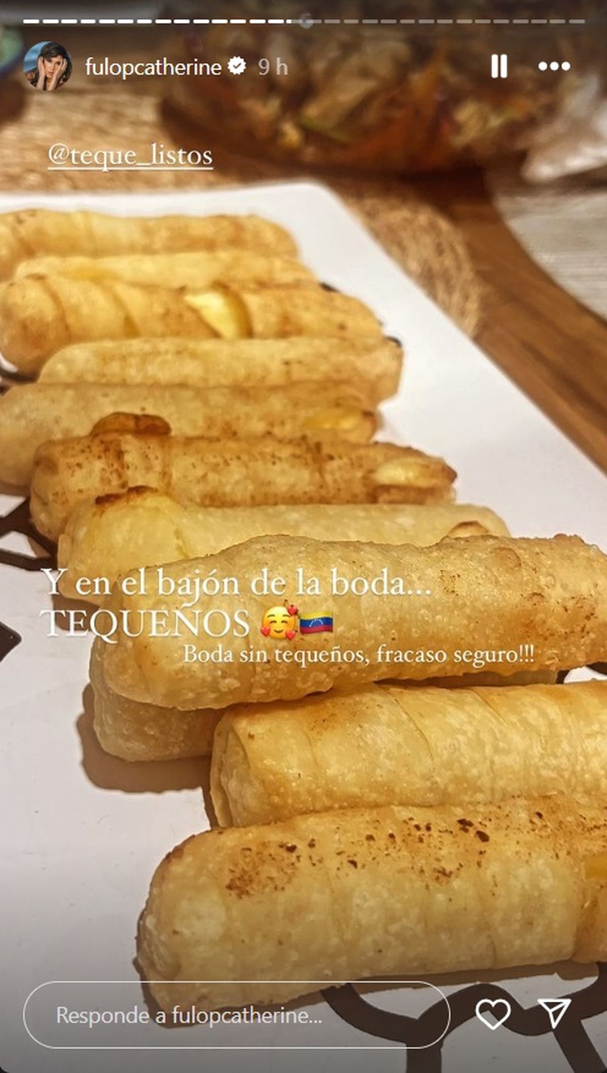 "Y en el bajón de la boda... ¡tequeños! Boda sin tequeños, fracaso seguro!!!", indicó Cathy con la imagen de la comida en cuestión y el emoji de la bandera de su país.