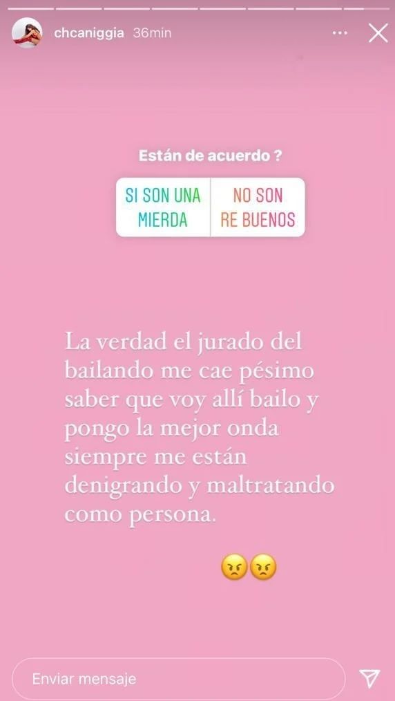 "La verdad es que el jurado de Bailando (Sic) me cae pésimo. Saber que voy ahí, bailo y pongo la mejor onda... Siempre me están denigrando y maltratando como persona", aseguró Charlotte junto a un montón de emojis que transmiten enojo.