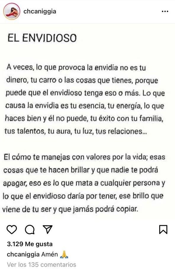 Allí, de manera indirecta, aludió a su relación con Pampita después de su fugaz paso como panelista de "Pampita online". "El envidioso. A veces lo que provoca la envidia no es tu dinero, tu carro o las cosas que tienes porque puede que el envidioso tenga eso o más. Lo que causa la envidia es tu esencia, tu energía, lo que haces bien y él no puede, tu éxito con la familia, tus talentos, tu aura, tu luz, tus relaciones. El cómo te manejas con valores por la vida, esas cosas que te hacen brillar y que nadie podrá apagar. Eso es lo que mata a cualquier persona y lo que el envidioso daría por tener, ese brillo que viene de tu ser y que nunca podrá copiar", posteó Charlotte.