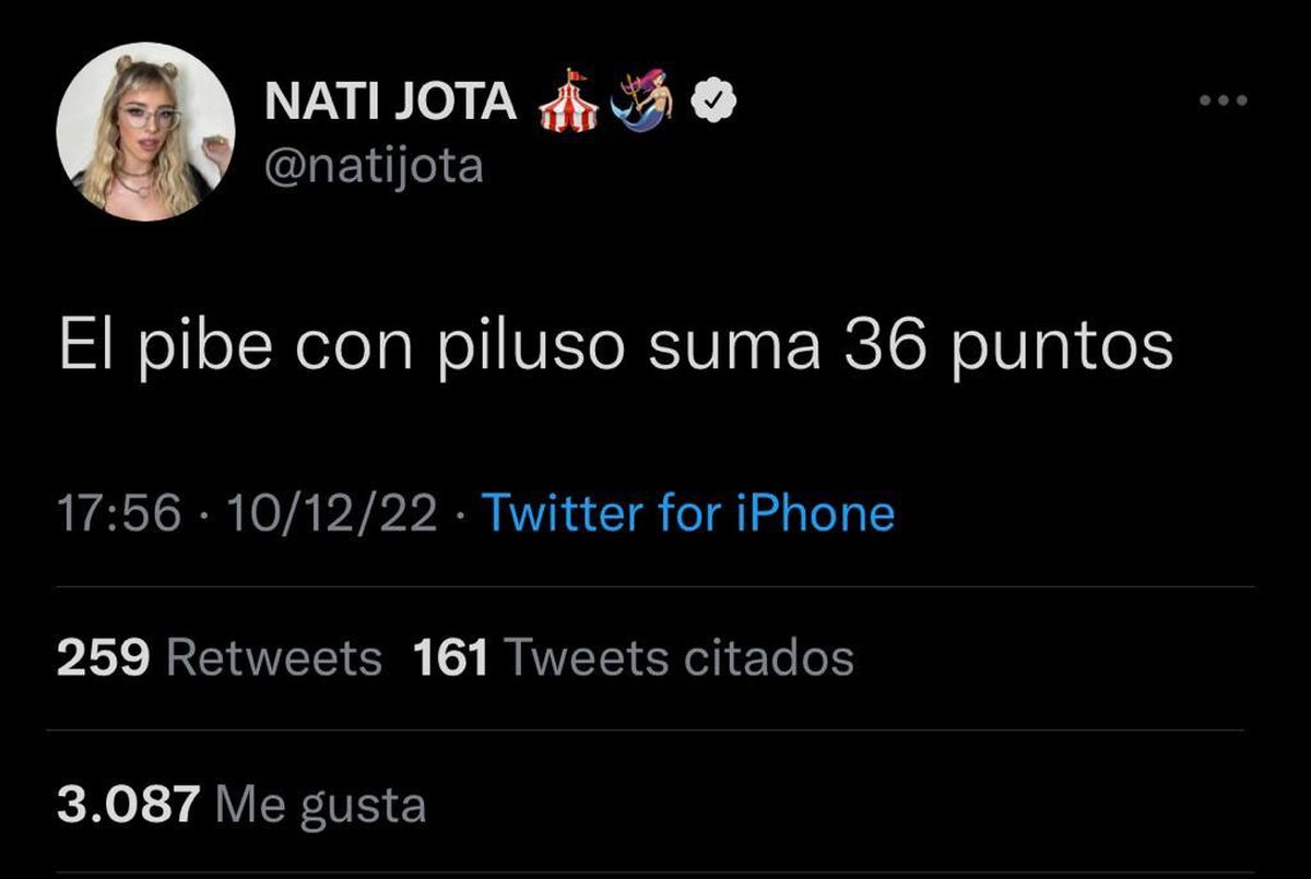 Luego de la entrevista, Nati Jota publicó en Twitter una frase: "El pibe con piluso suma 36 puntos".
