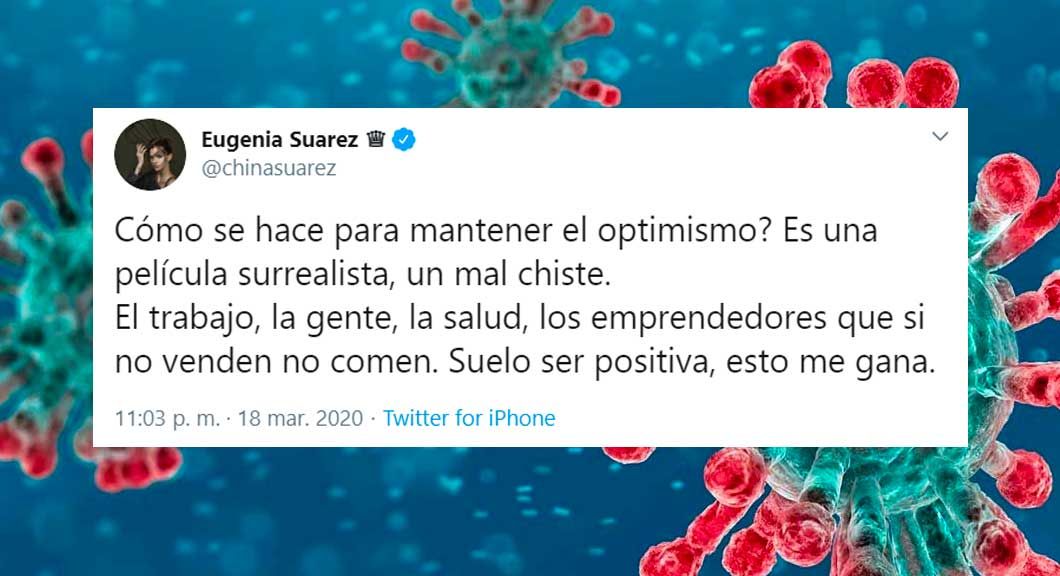 “¿Cómo se hace para mantener el optimismo? Es una película surrealista, un mal chiste”, comenzó escribiendo la actriz ayer un poquito antes de la medianoche. “El trabajo, la gente, la salud, los emprendedores que si no venden no comen. Suelo ser positiva, esto me gana”, terminó admitiendo Eugenia con mucha desazón.