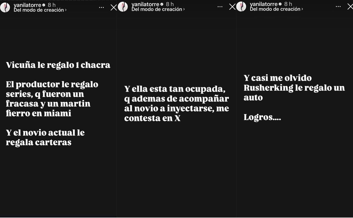 Pero claro que eso no fue todo, porque tras su picantísimo mensaje de X, desde sus historias virtuales de Instagram arremetió con todo. "Vicuña le regaló una chacra. El productor le regaló series, que fueron un fracaso y un Martín Fierro en Miami. Y el novio actual regala carteras", señaló a modo de recordatorio en sus ya clásicos posteos con fondo negro y letras blancas.