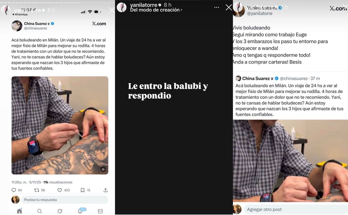 "Acá boludeando en Milán. Un viaje de 24 hs a ver al mejor fisio de Milán para mejorar su rodilla. 4 horas de tratamiento con un dolor que no te recomiendo. Yani, no te cansás de hablar boludeces? Aún estoy esperando que nazcan los 3 hijos que afirmaste de tus fuentes confiables", escribió a pura ironía la actriz y actual novia del ex de Wanda Nara.