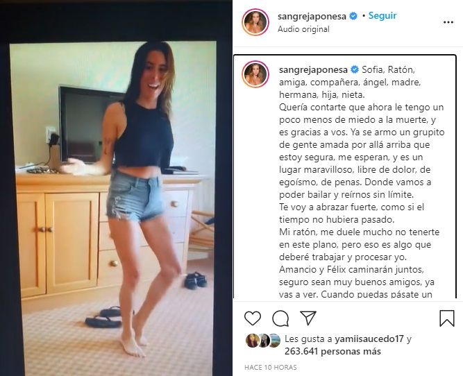 "Amancio y Félix caminarán juntos, seguro sean muy buenos amigos, ya vas a ver. Cuando puedas pásate un ratito por acá, yo siempre te espero. No pienso recordarte de otra manera que no sea esta. Te amo", finalizó Suárez, mostrando un video su amiga bailando que ella misma grabó y donde se escucha su voz atrás.