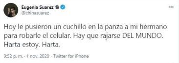 "Hoy le pusieron un cuchillo en la panza a mi hermano para robarle el celular. Hay que rajarse del mundo. Harta estoy. Harta", escribió la actriz indignada por el episodio.