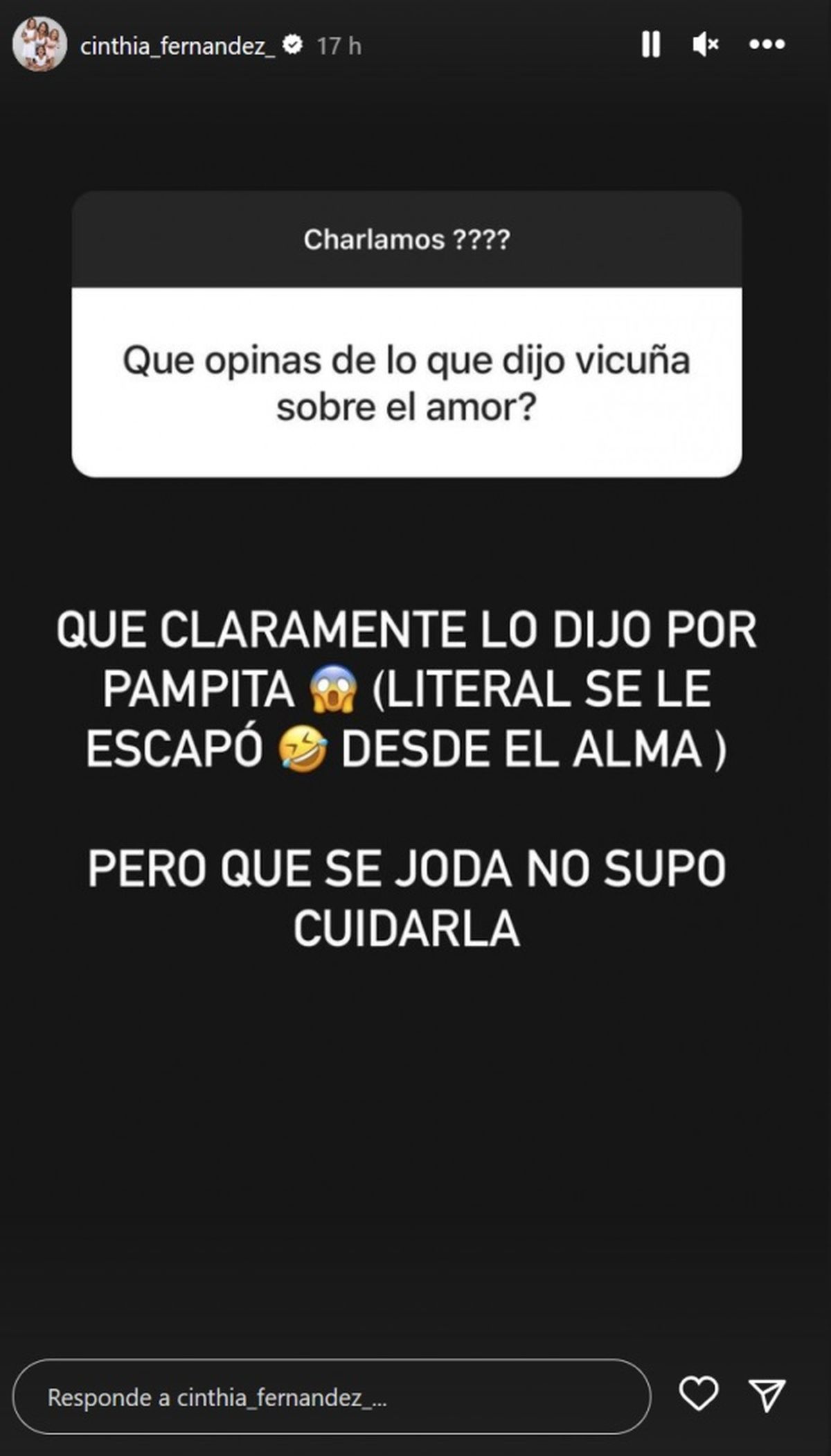 "Claramente, lo dijo por Pampita. Literal, se le escapó, desde el alma. Pero que se joda, no supo cuidarla", disparó fiel a su estilo desde sus Instagram Stories ante la consulta de un seguidor que le consultó su opinión.