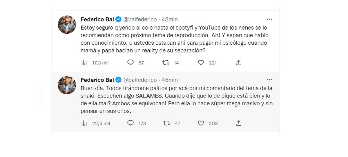 Luego, ante los comentarios que recibió en contra de lo que manifestó, Federico fue contundente en su descargo: "Buen día. Todos tirándome palitos por acá por mi comentario del tema de la Shaki. Escuchen algo salames. ¿Cuándo dije que lo de Piqué está bien y lo de ella mal? Ambos se equivocan! Pero ella lo hace súper mega masivo y sin pensar en sus críos".