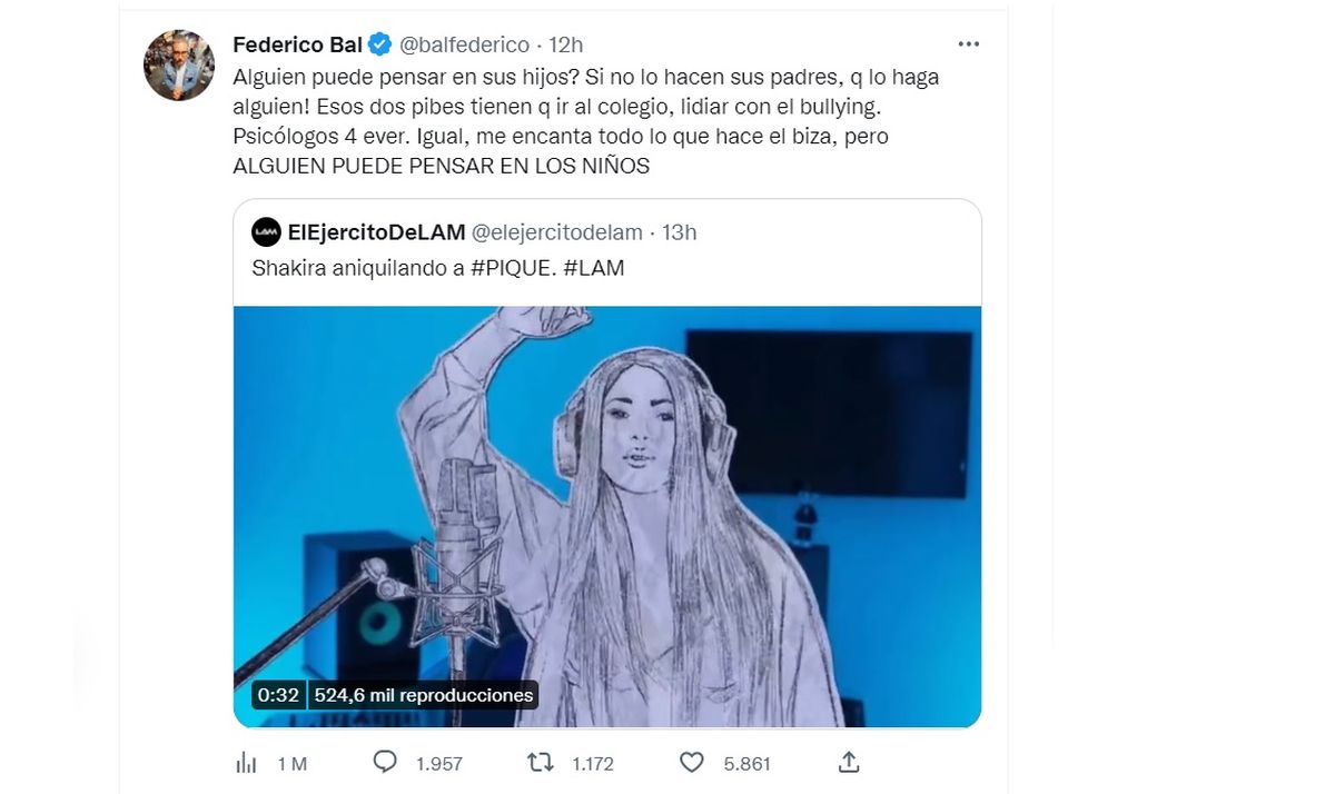 Federico Bal se refirió al estreno de la canción de Shakira junto a Bizarrap desde Twitter y dejó su picante opinión: "¿Alguien puede pensar en sus hijos? Si no lo hacen sus padres, que lo haga alguien! Esos dos pibes tienen que ir al colegio, lidiar con el bullying. Psicólogos 4 ever. Igual, me encanta todo lo que hace el biza, pero alguien puede pensar en los niños", cuestionó el protagonista de la obra Kinky Boots.