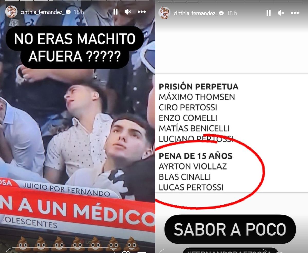 "¿No eras machito afuera?", lanzó desde sus historias con un picante emoji y la imagen de Thomsen descompensado. Y luego apuntó contra los 15 años de prisión que le dieron a 3 de los condenados. "Sabor a poco", remarcó en la lista de los jóvenes que participaron del asesinato.