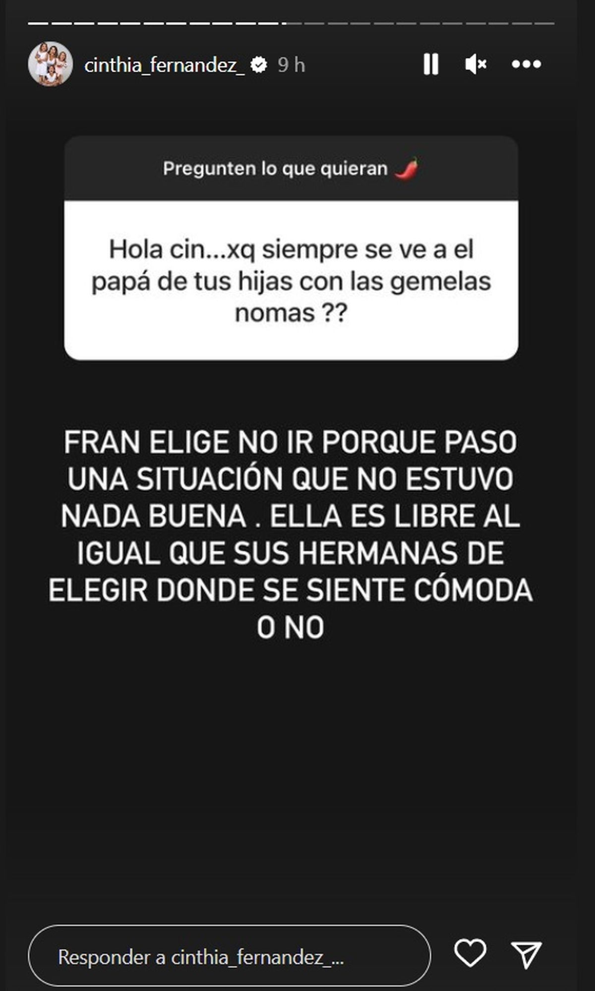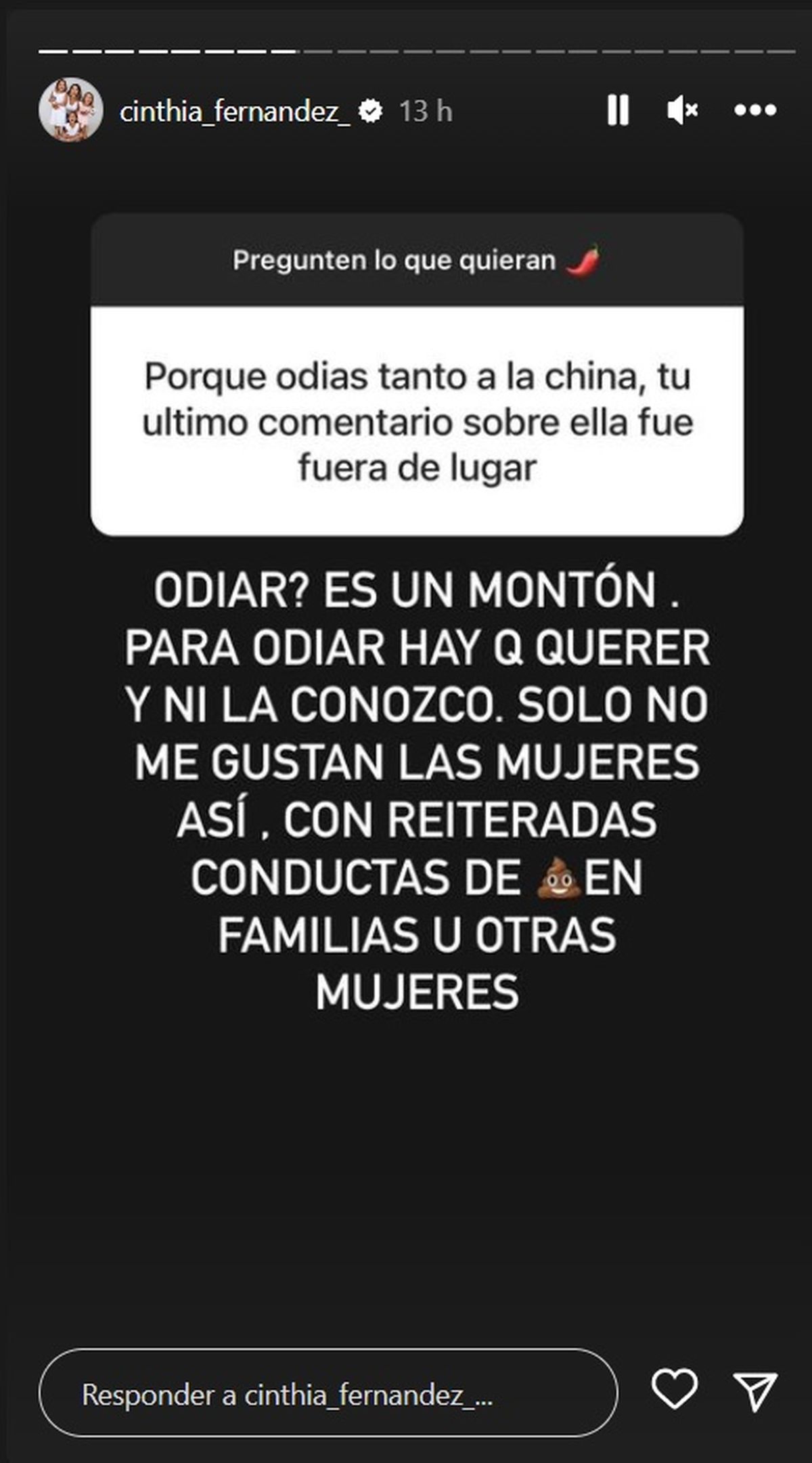 "¿Odiar? Es un montón. Para odiar hay que querer y ni la conozco. Solo no me gustan las mujeres así. Con reiteradas conductas de (emoji de cag...) en familias y otras mujeres", remarcó.
