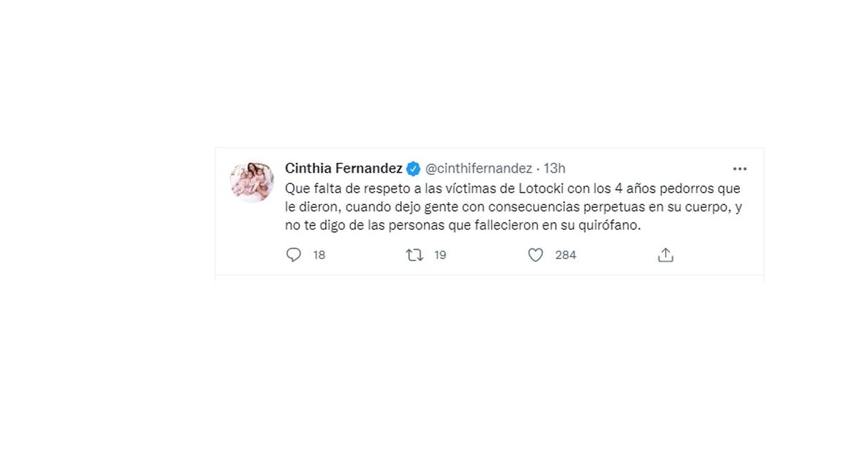 Al enterarse de este fallo, Cinthia Fernández mostró su indignación vía Twitter: "Qué falta de respeto a las víctimas de Lotocki con los 4 años pedorros que le dieron, cuando dejo gente con consecuencias perpetuas en su cuerpo, y no te digo de las personas que fallecieron en su quirófano".