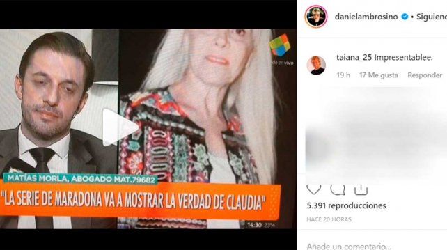 Mientras contaba esto en una entrevista con "Intrusos", Dani Ambrosino le señaló a Claudia que su pareja, Jorge Taiana, había comentado una publicación del panelista en Instagram en la que Matías Morla hablaba sobre la serie de la vida de Diego Maradona. Taiana escribió "impresentable" y Claudia se mostró contenta.