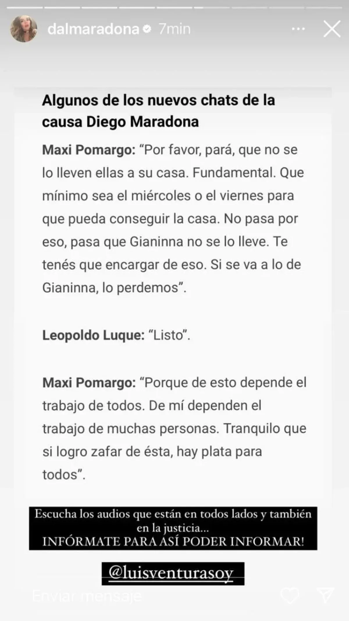 En su cuenta de Instagram, Dalma compartió los chats que Maxi Pomargo, cuñado de Matías Morla, mantuvo con el médico Leopoldo Luque, en los días previos al deceso del ídolo de los argentinos.