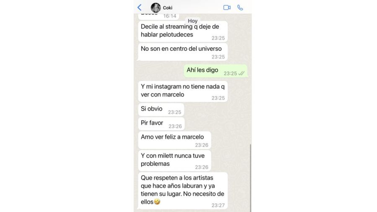 "Decile al streaming que deje de hablar pelotudeces. No son el centro del universo. Y mi Instagram no tiene nada que ver con Marcelo. Amo ver feliz a Marcelo, y con Milett nunca tuve problemas. Que respeten a los artistas que hace año laburan y ya tienen su lugar. No necesito de ellos", fue el descargo de la cordobesa.