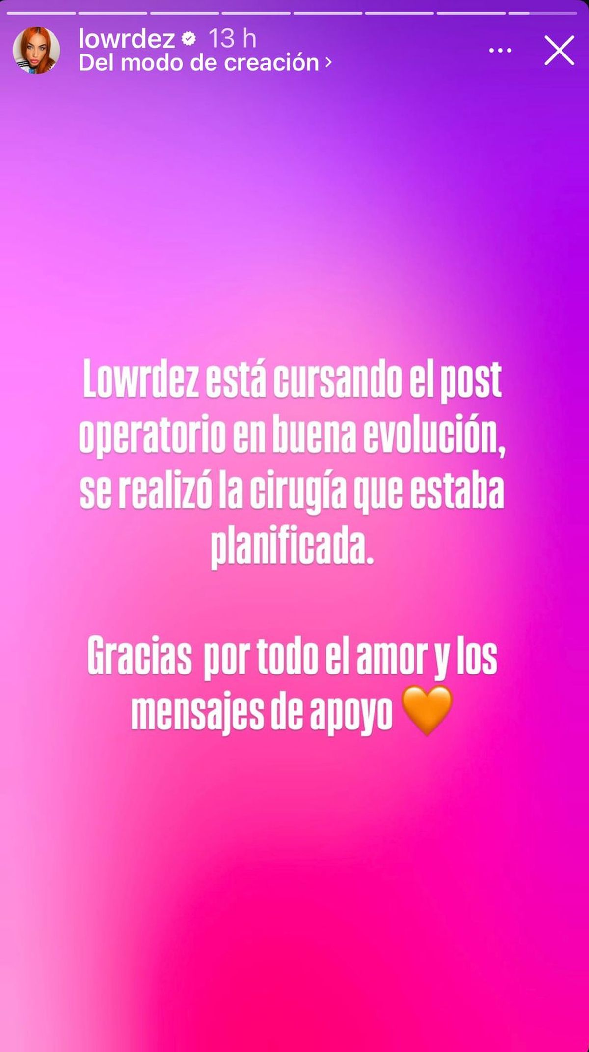 Por otro lado, desde la cuenta de Instagram de la integrante de Bandana, sus familiares le hicieron saber a todo su fandom que la intervención había sido exitosa. "Lowrdez está cursando el postoperatorio en buena evolución, se realizó la cirugía que estaba planificada", avisaron a través de las historias virtuales de la artista y agradecieron todo el amor y los mensajes de apoyo recibidos en las últimas horas.