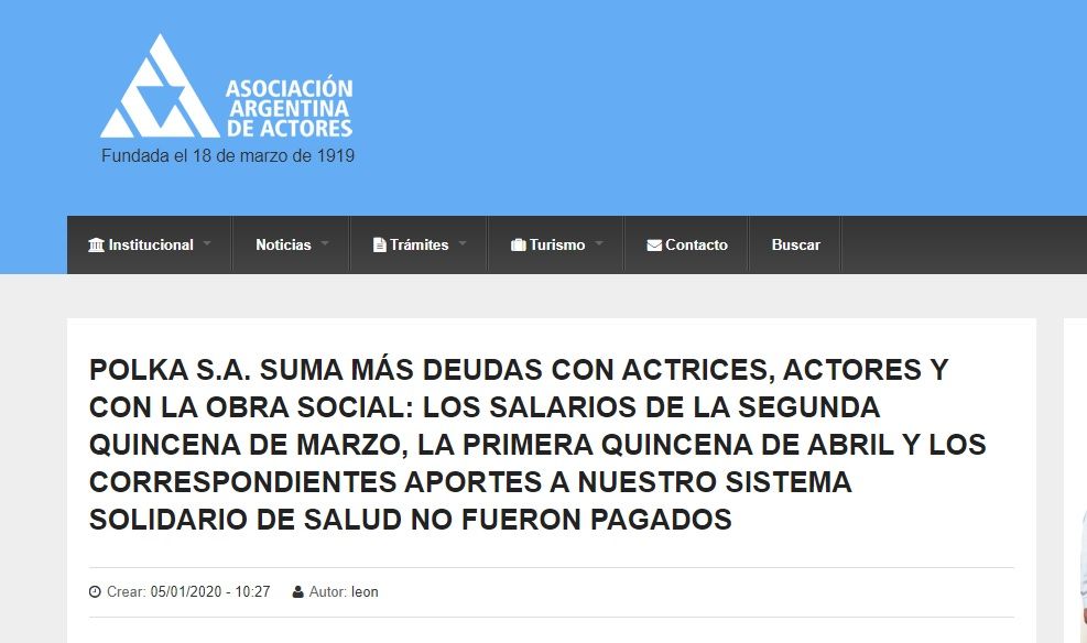 "PolKa S.A suma más deudas con actrices, actores y con la obra social. Los salarios de la segunda quincena de marzo, la primera quincena de abril y los correspondientes aportes a nuestro sistema solidario de salud no fueron pagados", se informó hace unas semanas desde el sitio web de la entidad.