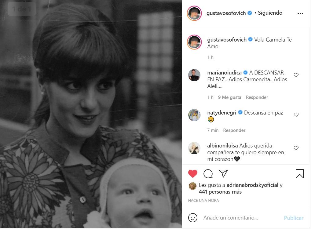 Su hijo, Gustavo Sofovich, usó unas cortas palabras para despedir a su mamá pero compartió una tierna foto en su perfil de Instagram.