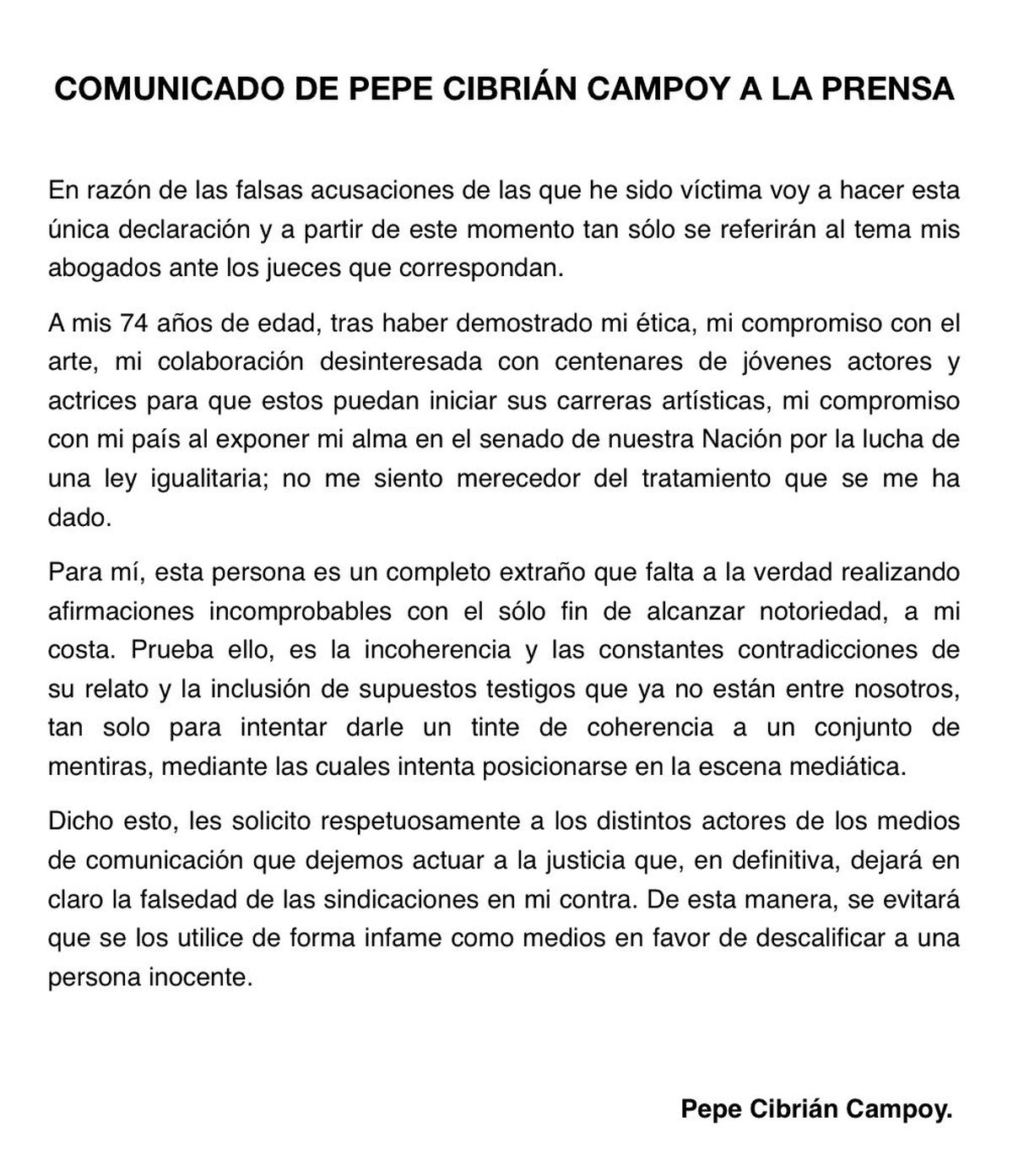 Dicho esto, les solicito respetuosamente a los distintos actores de los medios de comunicación que dejemos actuar a la justicia que, en definitiva, dejará en claro la falsedad de las sindicaciones en mi contra. De esta manera, se evitará que se los utilice de forma infame como medios en favor de descalificar a una persona inocente.