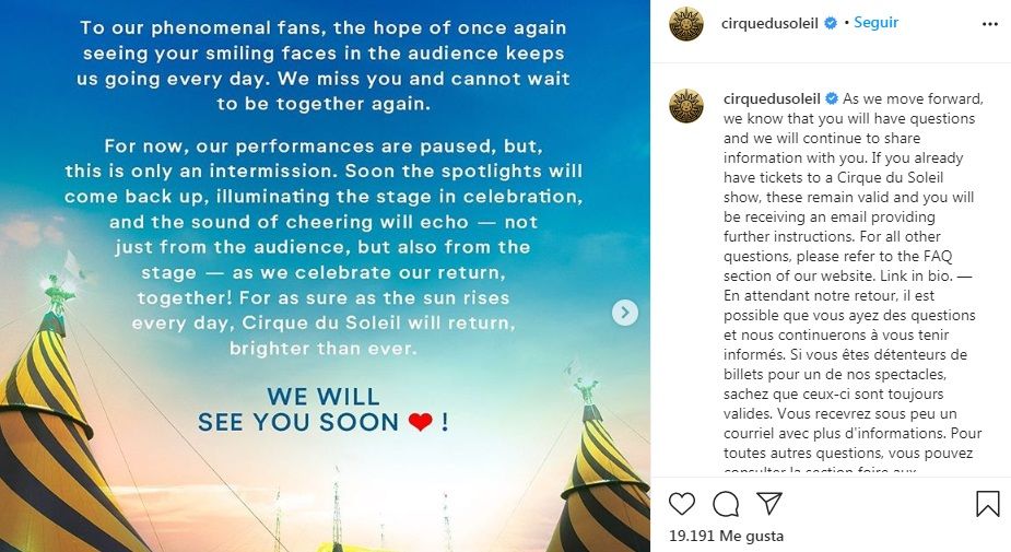 El presidente de la compañía, Daniel Lamarre, destacó que "durante los pasados 36 años, Cirque du Soleil ha sido una organización muy exitosa y rentable" pero "sin ingresos desde el cierre forzado" de todos sus espectáculos debido al coronavirus, la dirección "ha actuado de forma decisiva para proteger el futuro de la compañía".