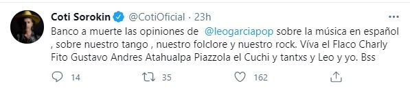 Ante la repercusión de sus mensajes, Coti Sorokin salió a bancarlo desde la misma red social.