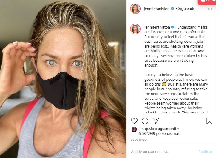 "No podemos ser tan ingenuos como para pensar que podemos escapar de esto", hacía ver Aniston. "Si queremos que esto termine, y queremos, ¿verdad? El único paso que podemos dar es, POR FAVOR, usar una mascarilla", animaba.