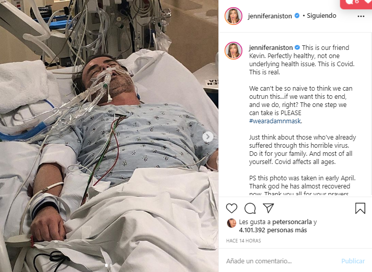 "Este es nuestro amigo Kevin. Estaba perfectamente saludable, no tenía ningún problema de salud subyacente. Esto es la Covid. Esto es real", escribía la actriz junto a la imagen. ⠀