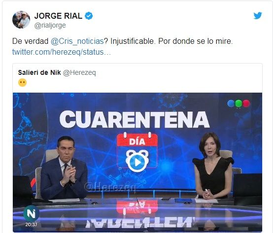 Jorge Rial no quiso dejar pasar la situación apuntó contra su colega. "¿De verdad, Cristina? Injustificable por donde se lo mire", disparó picante en la red social del pajarito.