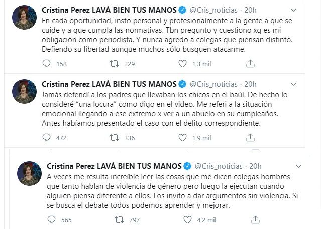 Ante las críticas que surgieron, Cristina se refirió a este tema vía Twitter: "A veces me resulta increíble leer las cosas que me dicen colegas hombres que tanto hablan de violencia de género pero luego la ejecutan cuando alguien piensa diferente a ellos. Los invito a dar argumentos sin violencia. Si se busca el debate todos podemos aprender y mejorar".