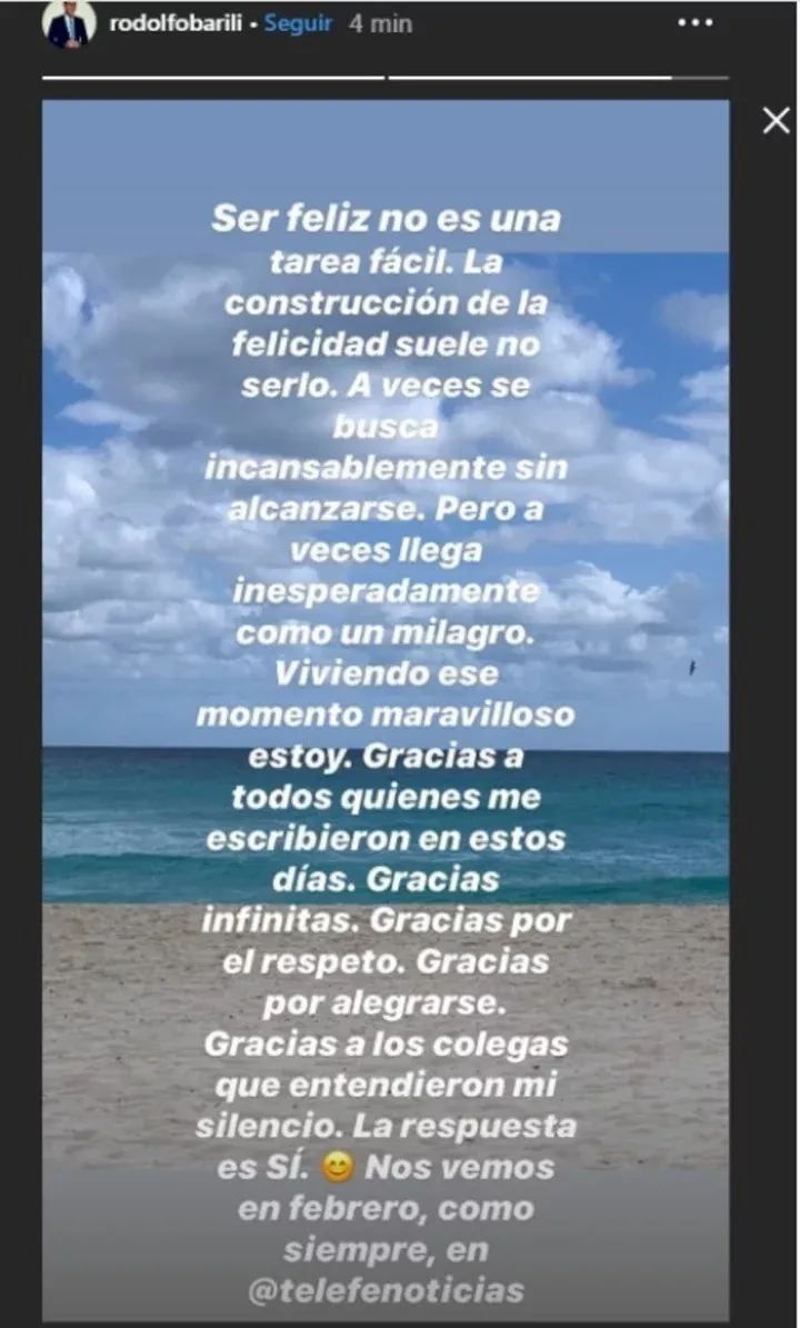 Consultada sobre qué le pareció la noticia, Cristina afirmó: “Estoy muy feliz por ver a Rodolfo feliz. Se lo merece mucho. Y está con una persona que lo ama y lo cuida como merece”.