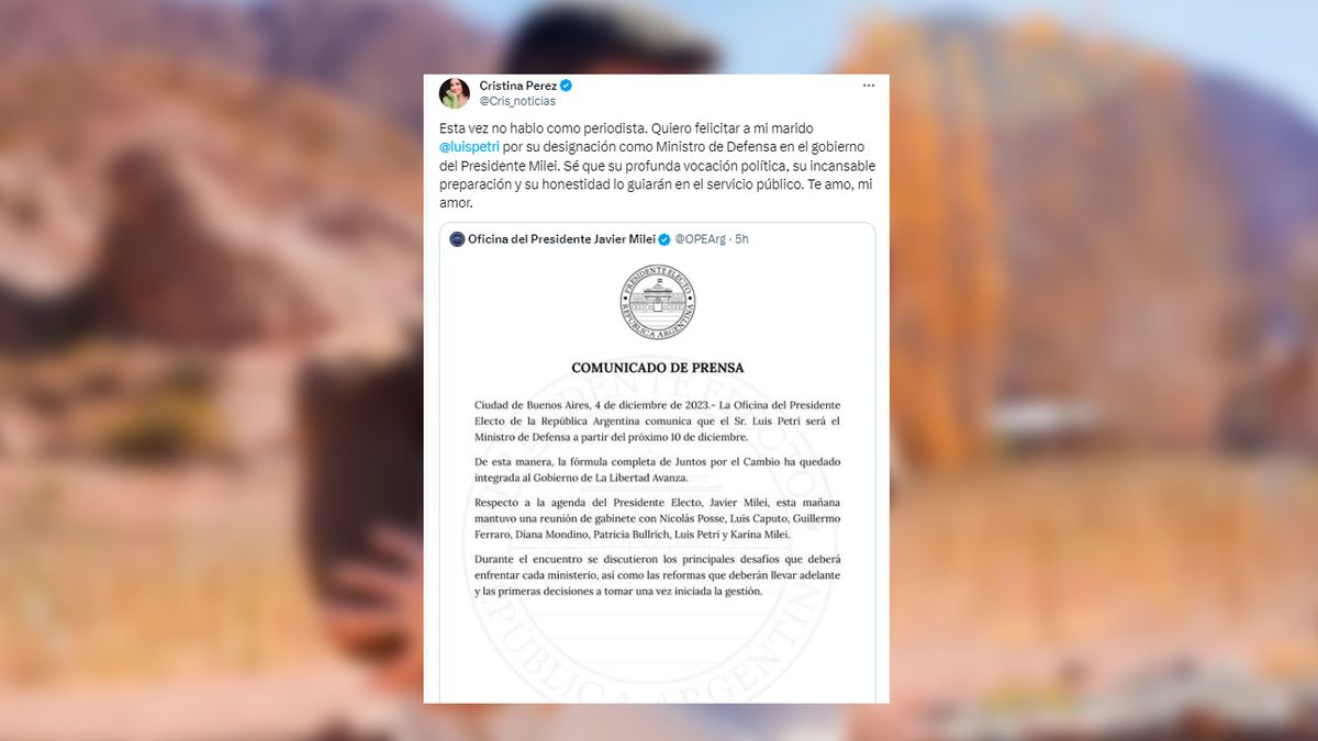 Tras el anuncio oficial, Cristina Pérez se pronunció en su cuenta de Twitter para felicitar a su pareja, Luis Petri. “Esta vez no hablo como periodista. Quiero felicitar a mi marido Luis Petri por su designación como Ministro de Defensa en el gobierno del Presidente Milei”, manifestó.