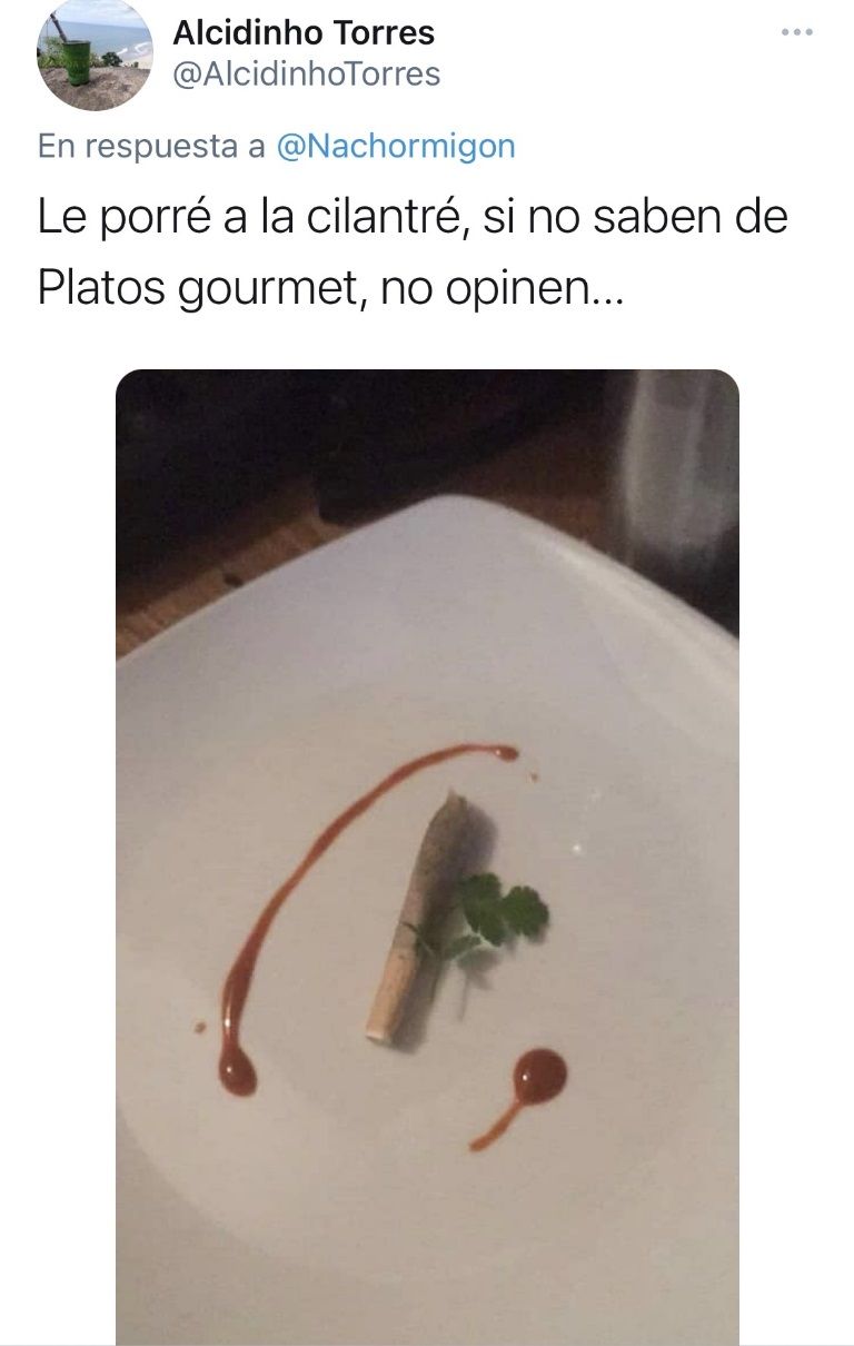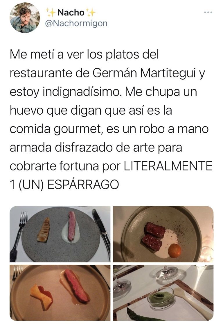"Me metí a ver los platos del restaurante de Germán Martitegui y estoy indignadísimo. Me chupa un huevo que digan que así es la comida gourmet, es un robo a mano armada disfrazado de arte para cobrarte fortuna por LITERALMENTE 1 (UN) ESPÁRRAGO", indicó el joven en Twitter, en un posteo en el que compartió fotos de las preparaciones que ofrece el cocinero en su local gastronómico.