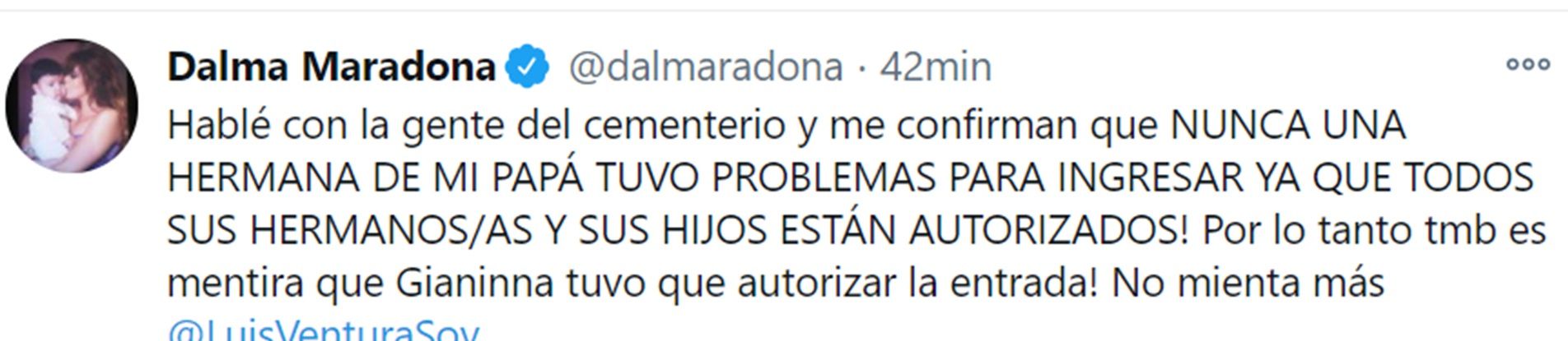 Lo cierto es que Dalma Maradona hizo un fuerte descargo en Twitter en el que asegura que ni ella ni su hermana Gianinna impidieron que familiares directos puedan entrar al lugar donde descansan los restos de su padre.
