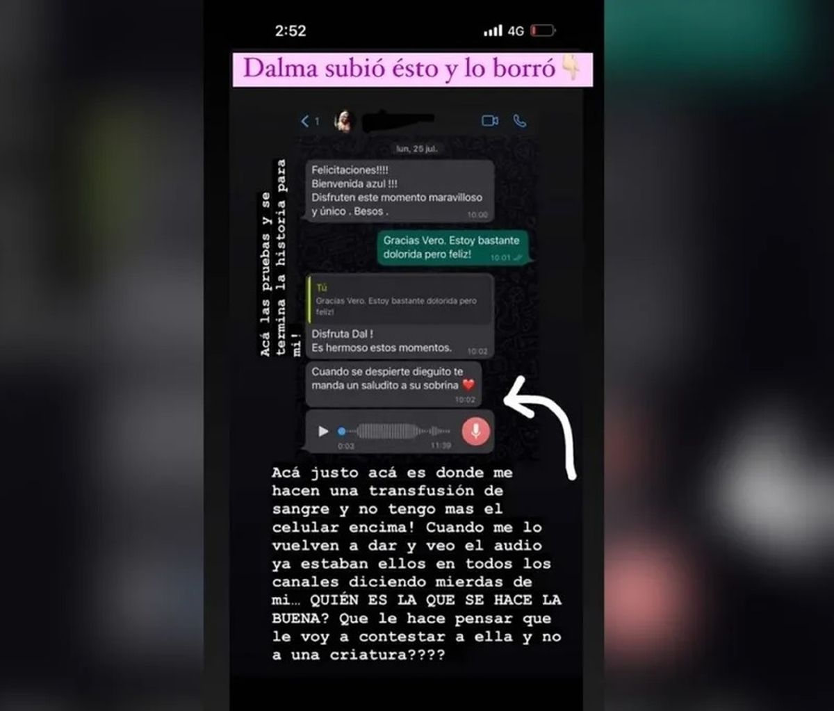 Luego, se ve que Verónica le envía un audio de Dieguito Fernando felicitándola: "Cuando se despierte Dieguito le manda un saludito a su sobrina". Ante la falta de respuesta a ese mensaje, se desató la polémica y Dalma aclaró: "¡Acá justo es cuando me hacen una transfusión de sangre y no tengo más el celular encima!".