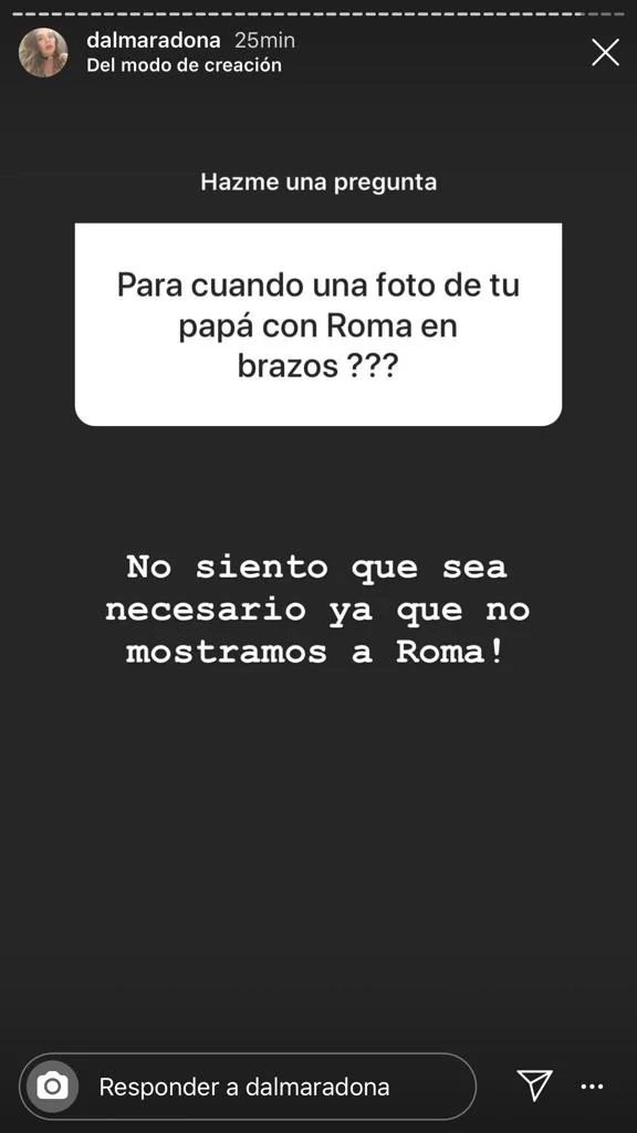 Y en las últimas horas, a través de las historias de Instagram, Dalma contestó a varias preguntas de sus seguidores. "¿Para cuándo una foto de tu papá con Roma en brazos?", le consultaron.