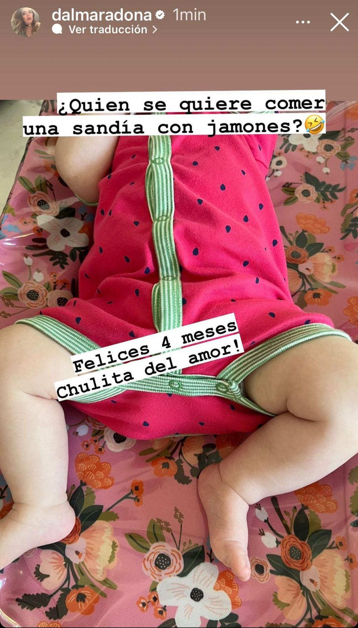 Es por eso que sobre el mediodía de este jueves, la hija de Diego Maradona y Claudia Villafañe celebró el cumplemés de la beba desde su cuenta pública de Instagram. "Quién se quiere comer esta sandía con jamones?" escribió Dalma Maradona sobre la foto de Azul con un enterito emulando la popular fruta veraniega desde una historia virtual.