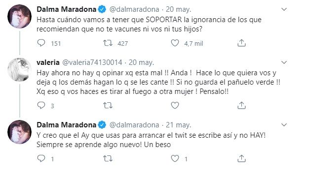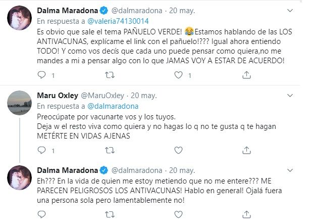 Ante el tuit, Dalma respondió: "Es obvio que sale el tema PAÑUELO VERDE. Estamos hablando de LOS ANTI-VACUNAS, explicame el link con el pañuelo. Igual, ahora entiendo todo. Y como vos decís que cada uno puede pensar como quiera, no me mandes a mí a pensar algo con lo que jamás voy a estar de acuerdo".