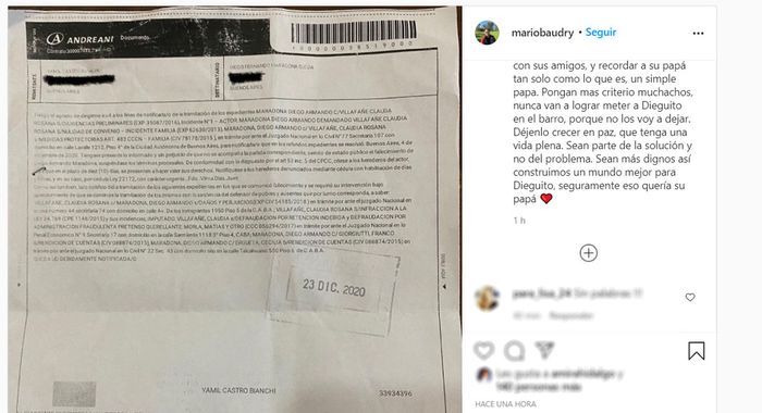 Mario Baudry contó desde Instagram que recibieron una carta documento dirigida a Dieguito Fernando, hijo de siete años de Diego Armando Maradona.