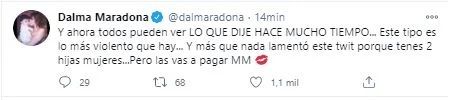 Dalma también dejó un fuerte mensaje de manera directa contra el ex abogado de su padre: “Y ahora todos pueden ver LO QUE DIJE HACE MUCHO TIEMPO... Este tipo es lo más violento que hay... Y más que nada lamentó este twit porque tenés 2 hijas mujeres...Pero las vas a pagar MM”, escribió indignada.