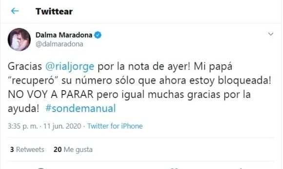 Y al parecer que sus declaraciones no pasaron desapercibidas. “Gracias @rialjorge por la nota de ayer. Mi papá “recuperó” su número solo que ahora estoy bloqueada. No voy a parar, pero igual muchas gracias por la ayuda. #sondemanual”, manifestó la actriz en Twitter.