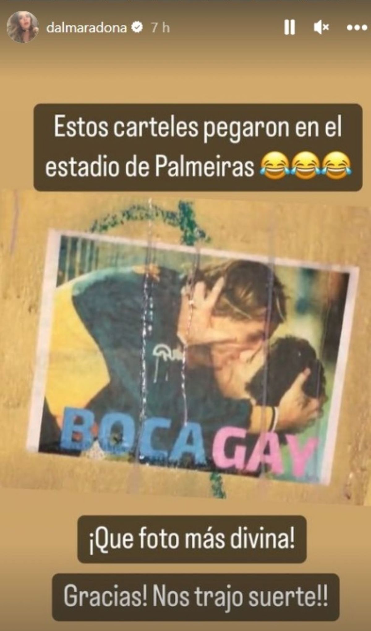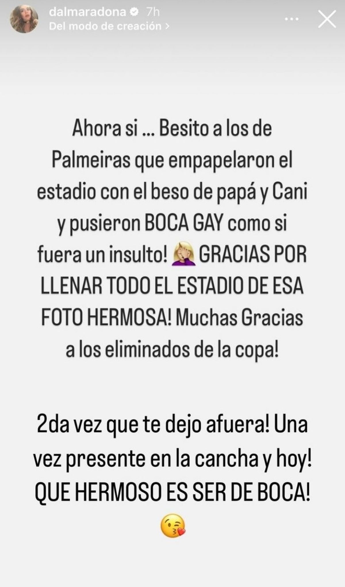 Al tiempo que, ya con Boca Juniors metido en la final del torneo futbolístico que consagra al campeón continental de Sudamérica, la hija mayor de Diego Maradona remató en otra storie: "Ahora sí...Besito a los del Palmeiras que empapelaron el estadio con el beso de papá y el Cani y pusieron Boca Gay como si fuera un insulto".