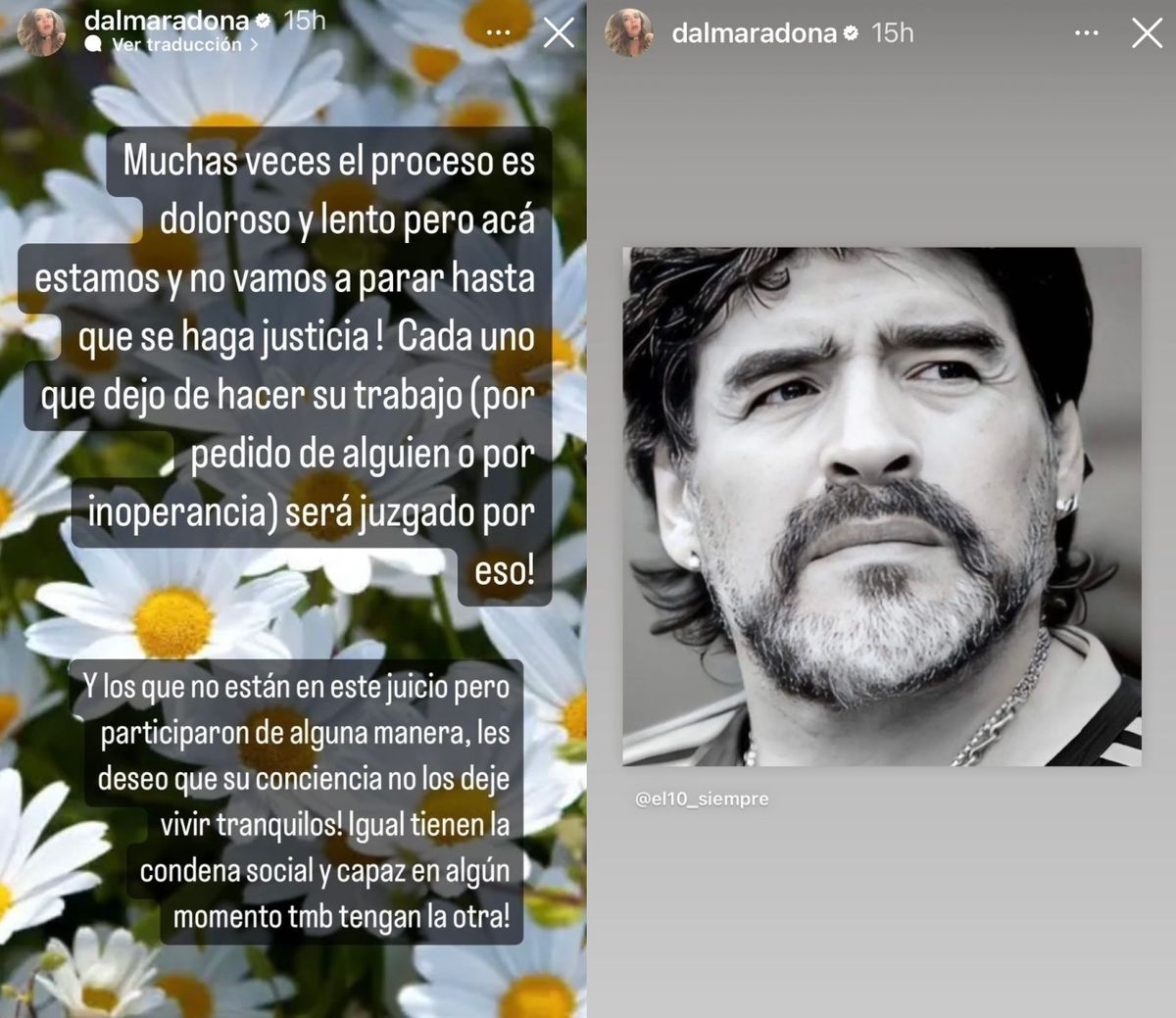 "Muchas veces el proceso es doloroso y lento pero acá estamos y no vamos a parar hasta que se haga justicia. Cada uno que dejó de hacer su trabajo (por pedido de alguien o por inoperancia) será juzgado por eso. Y los que no están en este juicio pero participaron de alguna manera, les deseo que su conciencia no los deje vivir tranquilos", escribió Dalma desde sus Instagram Stories con una imagen de fondo de margaritas y sumó luego una foto del astro futbolístico.