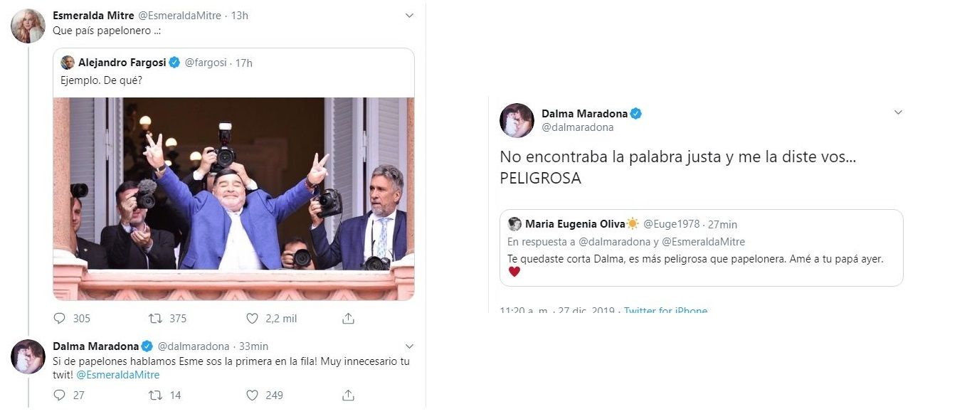 A lo que Esmeralda retrucó: "Lo mio es un comentario político, lo que faltaba es que yo no pueda comentar acerca de actos políticos. Con respecto a tu vida personal, siempre me solidaricé con ustedes públicamente y con mucho amor. Papelonera yo nada, verdadera. Aparte de un cv irrefutable. @gianmaradona".