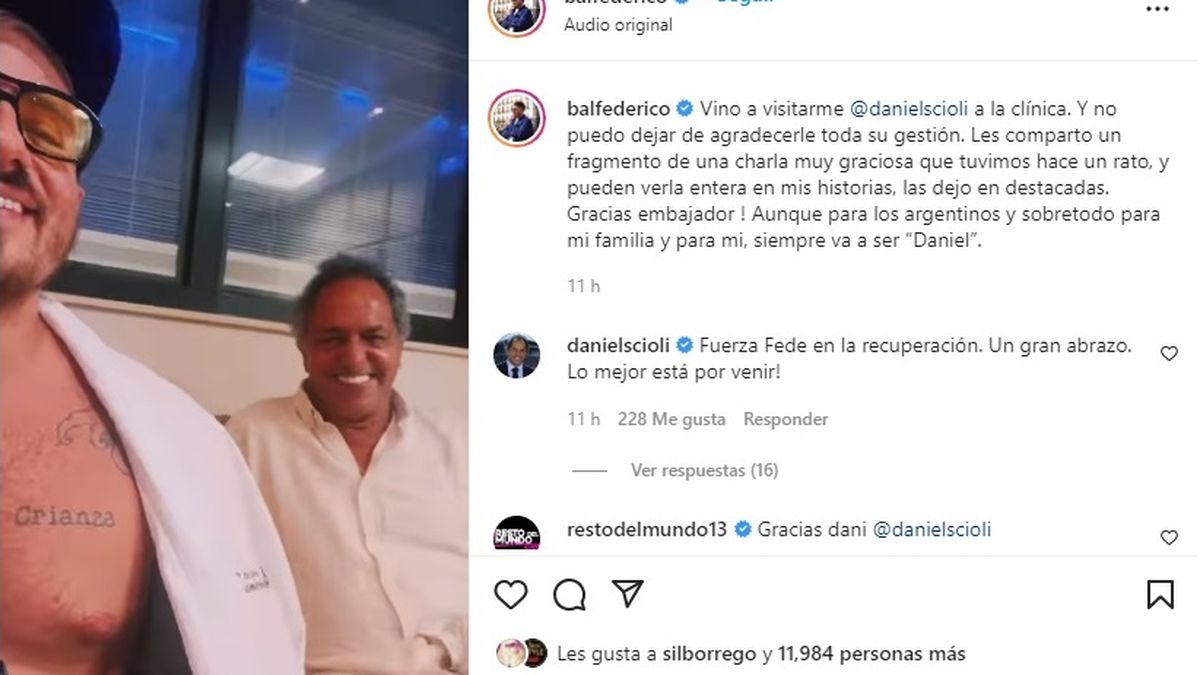 "Vino a visitarme @danielscioli a la clínica. Y no puedo dejar de agradecerle toda su gestión. Les comparto un fragmento de una charla muy graciosa que tuvimos hace un rato, y pueden verla entera en mis historias, las dejo en destacadas. Gracias embajador! Aunque para los argentinos y sobretodo para mi familia y para mi, siempre va a ser “Daniel”", precisó en el posteo de Instagram.